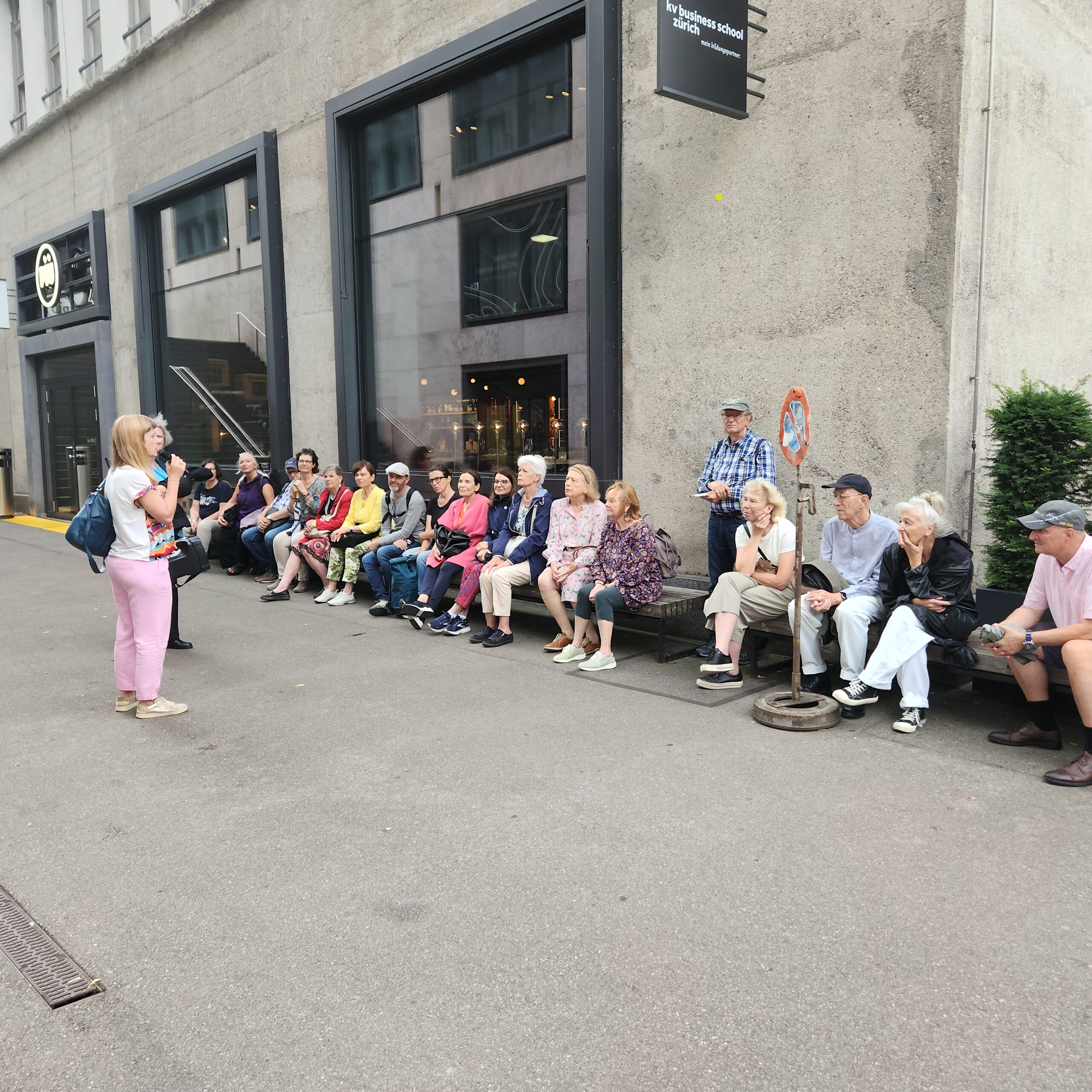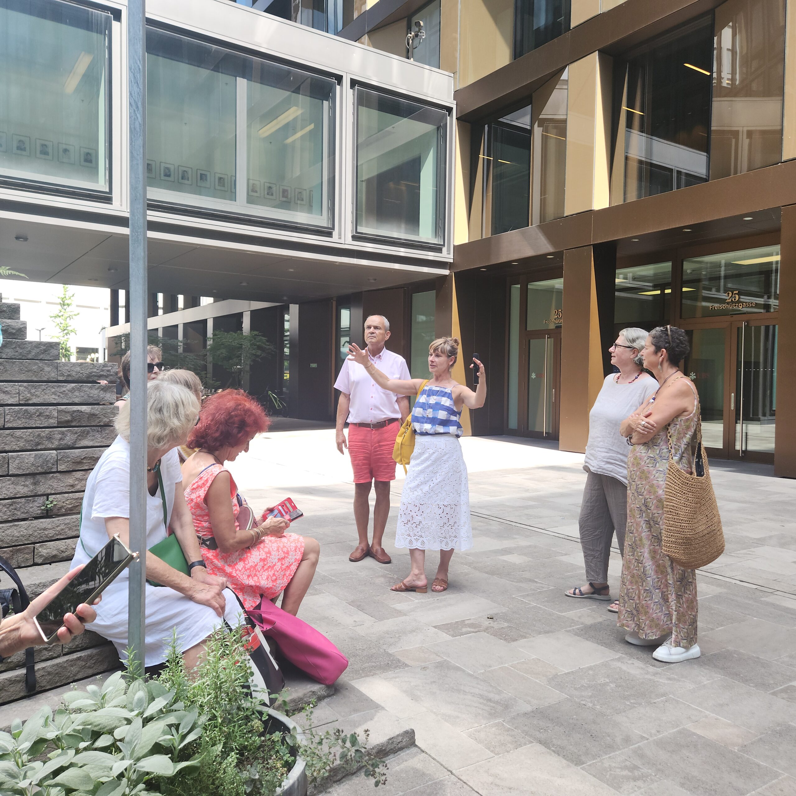 Die Führung im Juli war gut besucht und trotz leichtem Regen waren alle 21 TeilnehmerInnen hellauf begeistert. Ebenso am Freitag, 16. August 2024. Die Erwartungen von allen TeilnehmerInnen waren eigentlich sehr tief. Europaallee? Eine Führung? Da läuft man doch eigentlich einfach durch und was ist da so besonders?